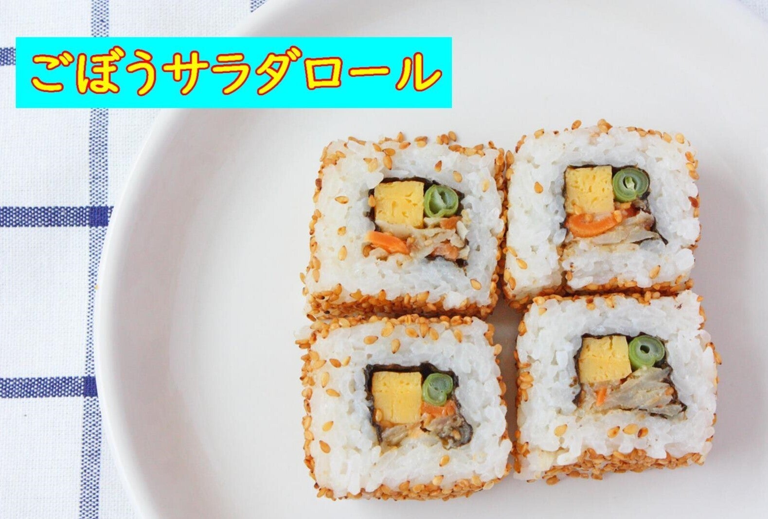 シャキシャキとした食感のごぼうサラダを使った裏巻き寿司です。ごぼうサラダと酢飯の相性がとてもいいです。具材は、ごぼうサラダと玉子焼きといんげんが入っています。ミニいなり寿司(黒米)と合わせると彩りも一層きれいです。