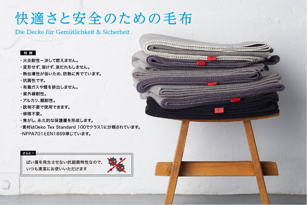 ファイアーブランケットは火炎耐性のある素材“PyroTex”100%で作られ ています。炎を防ぎ、製品自体が溶けたり、液だれ することはありません。また、抗菌性です。寸法 1.60×2.00m 重量:200g/㎡ 色 :ブラック、グレー ※パーカーはブラックのみ