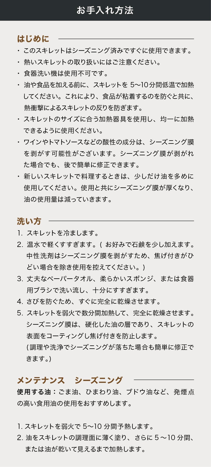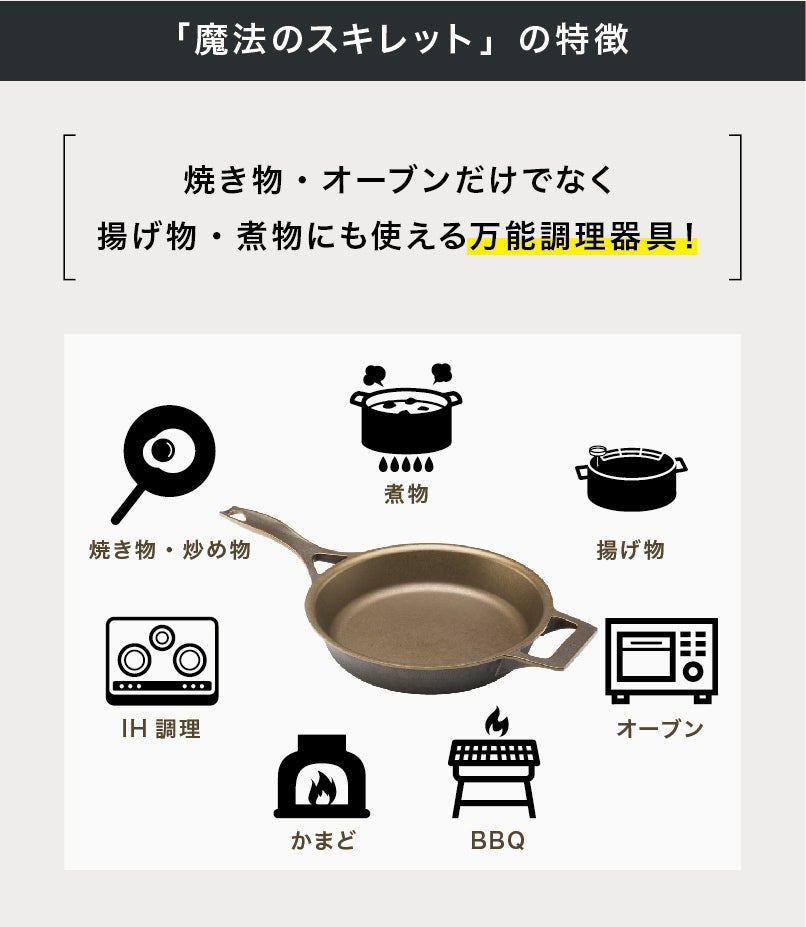 アメリカベストスキレット2020受賞製品。全面研磨した滑らかな調理面が特徴で、調理中食べものの付着は少なく、手入れも簡単!さらに鋳鉄の持つ「蓄熱性」,「遠赤外線による輻射熱」による力で素材本来の旨味を最大限引き出す事が出来る「魔法のスキレット」です。