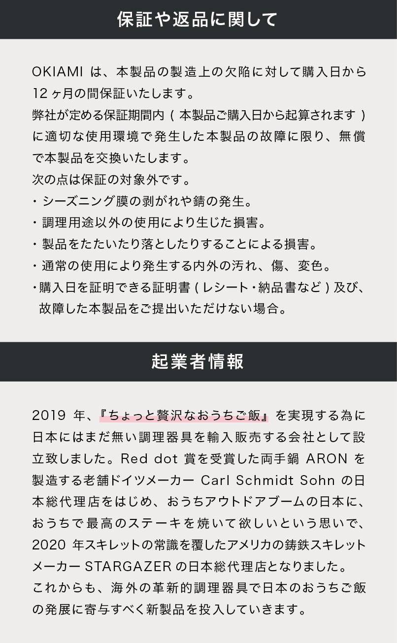 • 皆様大変お待たせいたしました。コンテナ船遅延の影響もありましたが本日無事出荷完了致しました。※スキレットレザーハンドルは別口での配送となります。13日発送にて郵送にて届きます。先にスキレット届いた方は少々お待ちください。スキレットはシーズニング済みの為、届きましたらすぐ使用できます。初めのうちは若干油を多めに使用お願い致します。どんどんシーズニング層が厚くなっていきあなただけのスキレットへ仕上がっていきます。フライパンとスキレットで作った料理の旨味の違いをぜひ味わってみてください!この度はご支援頂きまして誠にありがとうございました。引き続きOKIAMI「魔法のスキレット」を宜しくお願い致します。 もっと見る