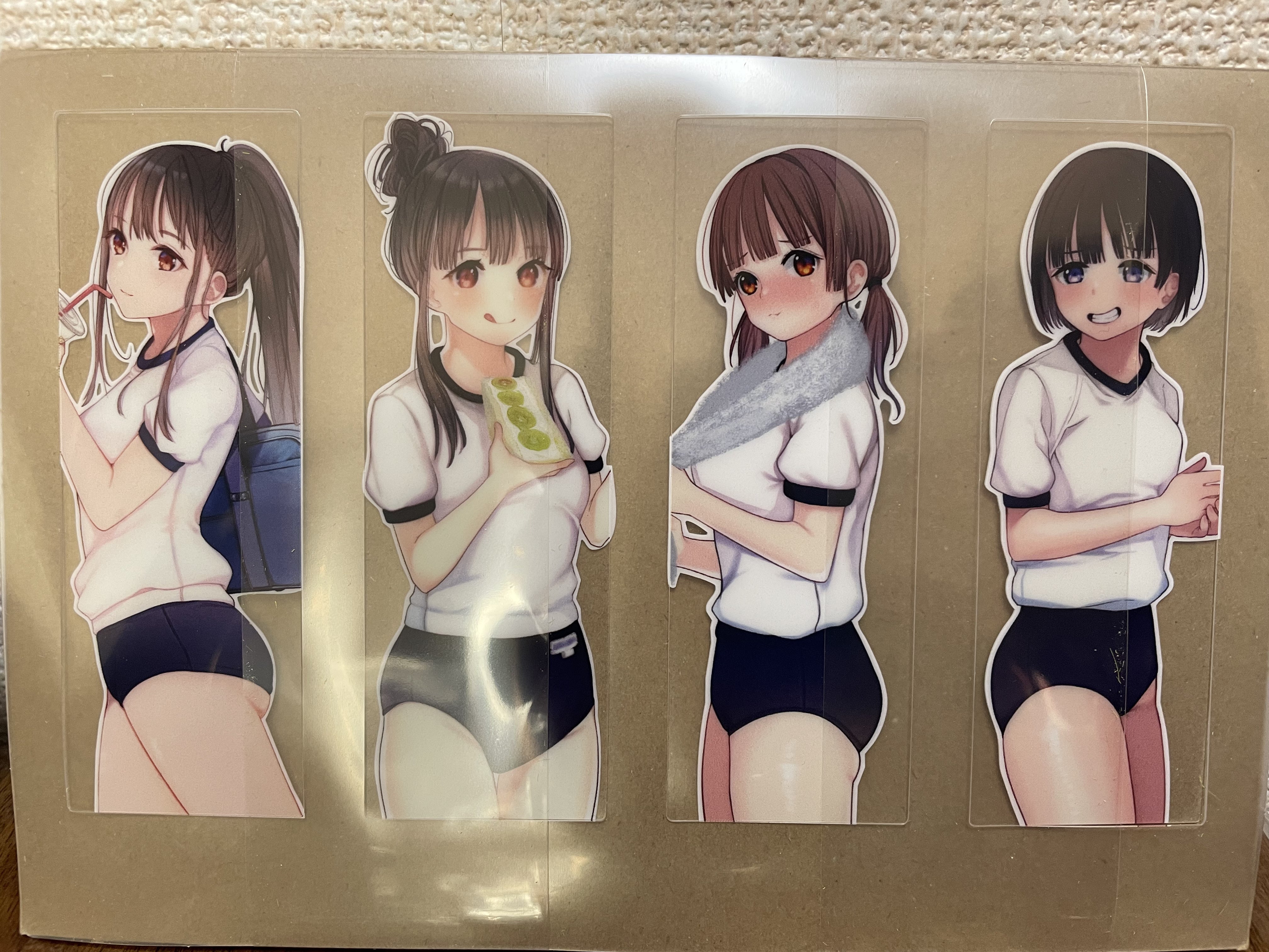 表紙絵などのイラストを含む4種類1セットのクリアしおりです。