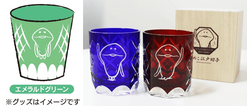 切子部分はこれまでの「瑠璃色」「赤色」の江戸切子と同じデザインを採用。なめこ部分のデザインは今回用に変更します。