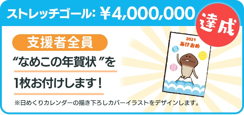 支援総額400万円達成で、支援者全員にプラン1口につき1枚「なめこの年賀状」をお付けします。