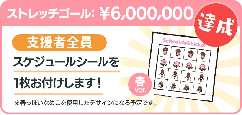 支援総額600万円達成で、支援者全員にプラン1口につき1枚「スケジュールシール 春ver.」をお付けします。