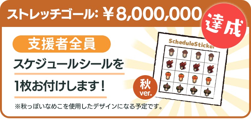 支援総額800万円達成で、支援者全員にプラン1口につき1枚「スケジュールシール 秋ver.」をお付けします。