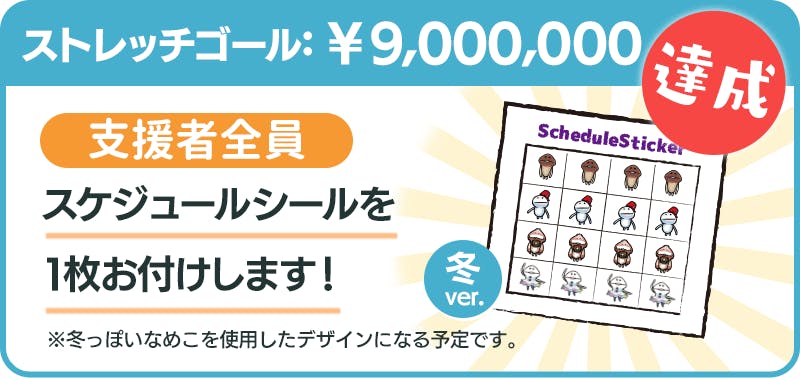 支援総額900万円達成で、支援者全員にプラン1口につき1枚「スケジュールシール 冬ver.」をお付けします。