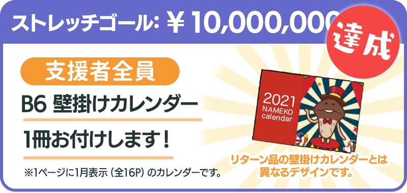 支援総額1,000万円達成で、支援者全員にプラン1口につき1冊「B6 コンパクト壁掛けカレンダー」をお付けします。(リターン品の「壁掛けカレンダー」とは全く別物です。デザイン・商品仕様ともに異なります)