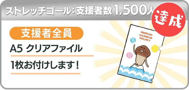 支援者数1500人達成で、支援者全員にプラン1口につき1枚「A5 クリアファイル」をお付けします。めくった後のお気に入りのページを保管したり、レシート入れにしたりするのにぴったりのサイズです。