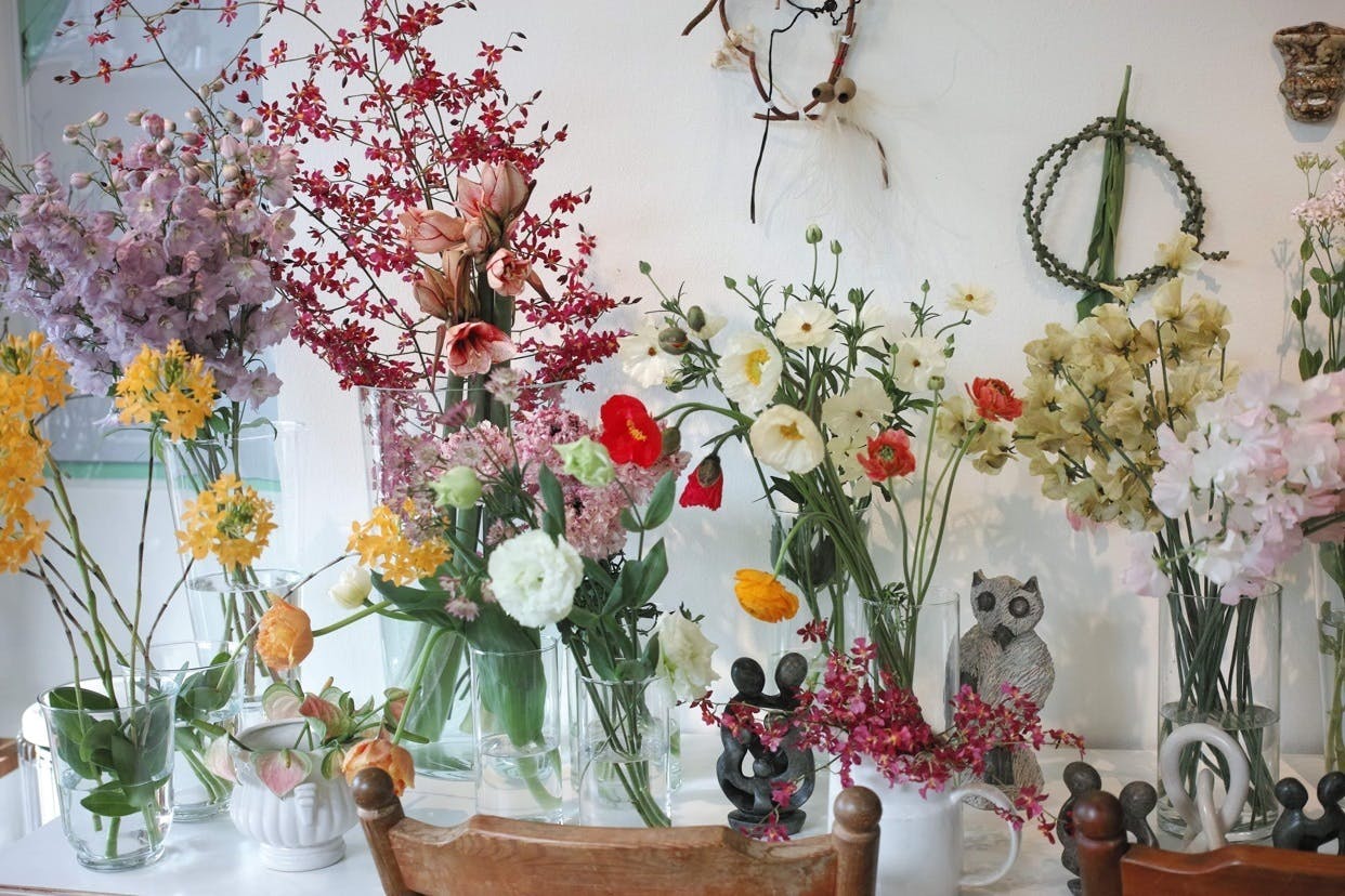 お店では1本から花を販売、ヴィンテージの花器など生活を楽しむアイテムもセレクトしている。
