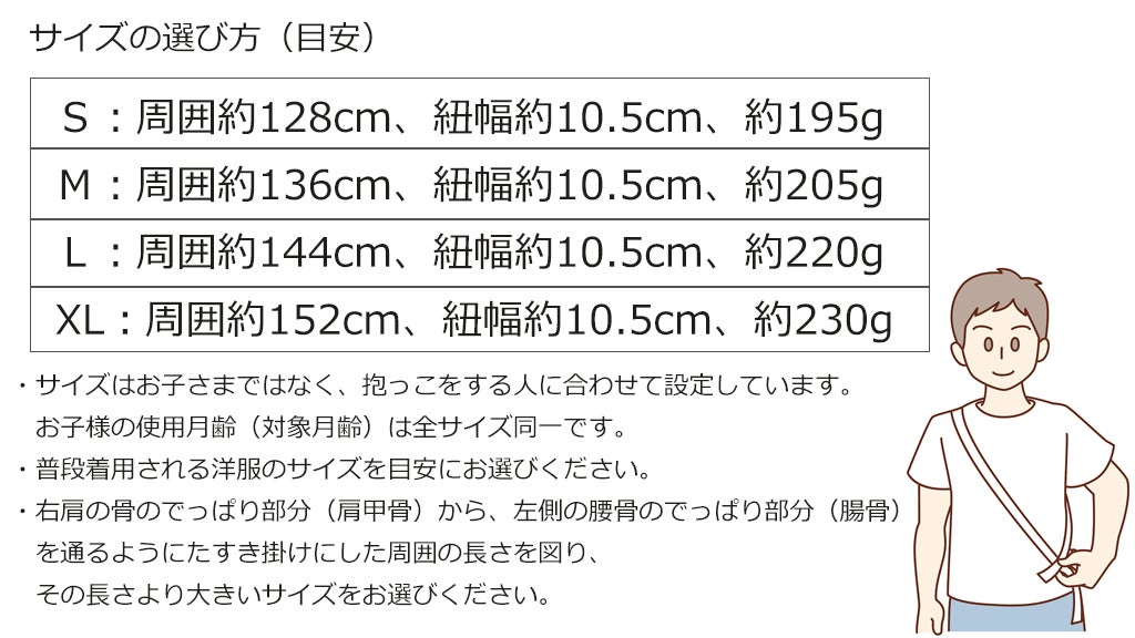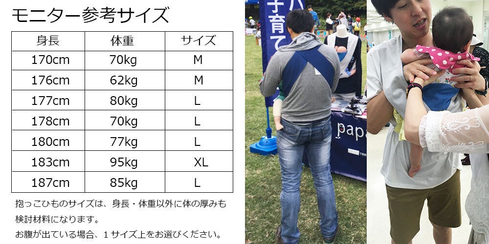 サイズはS・M・L・XLの4サイズ。身長170cm前後を想定したMサイズから、身長180cm以上のガッチリ体格のパパでも使えるXLサイズまでの4サイズを用意しています。