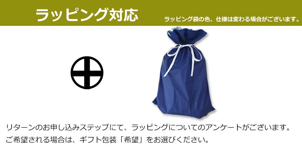 ギフト包装をご希望される方は、リターンの申し込み時に、ギフト包装についての選択肢にて「希望する」をお選びください。梨地のラッピング袋に入れてお届けします。(無料)