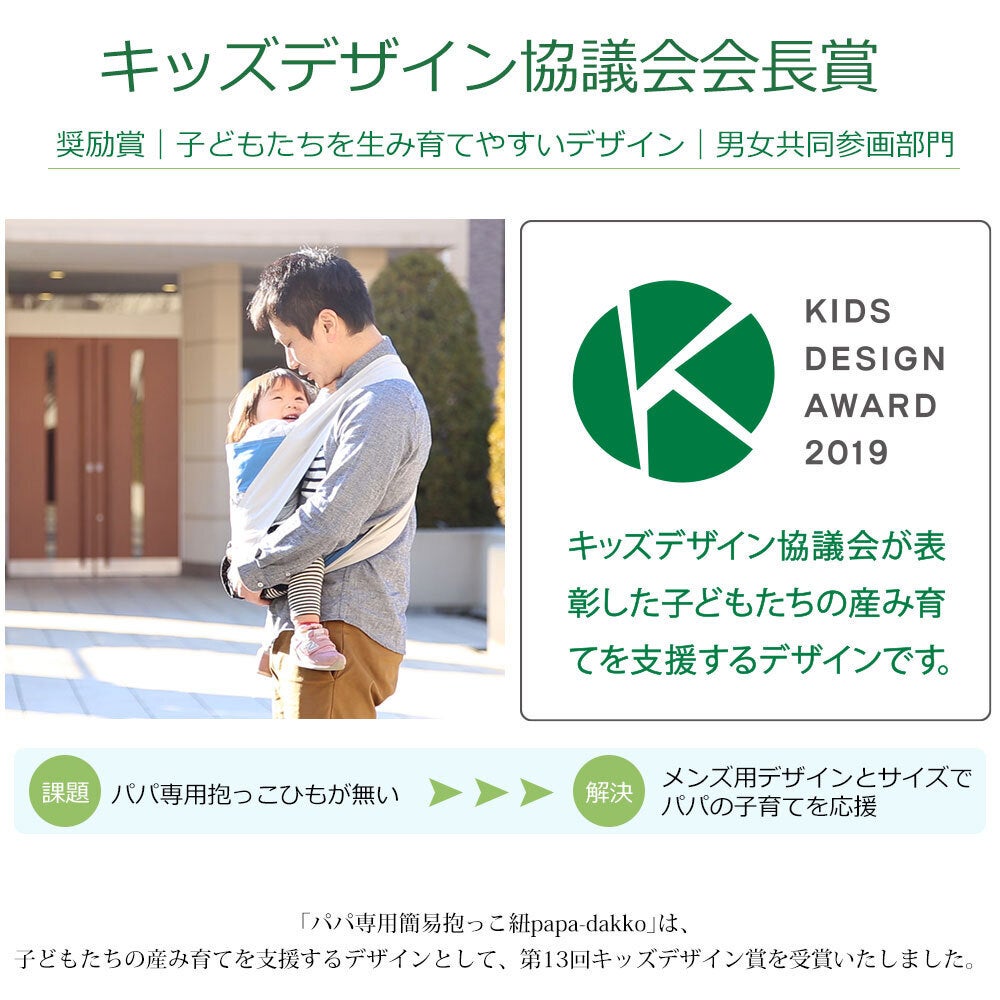 2019年 キッズデザイン賞 奨励賞受賞:パパ専用抱っこ紐「papa-dakko」