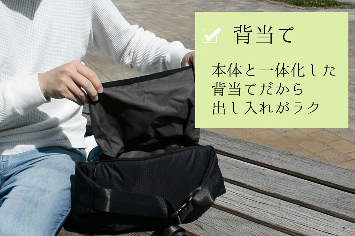 ボディーバッグとして使用したときのバッグの傾きや、抱っこ補助具として使用する際の座面の傾きを考え、最適な角度になるようデザインしています。