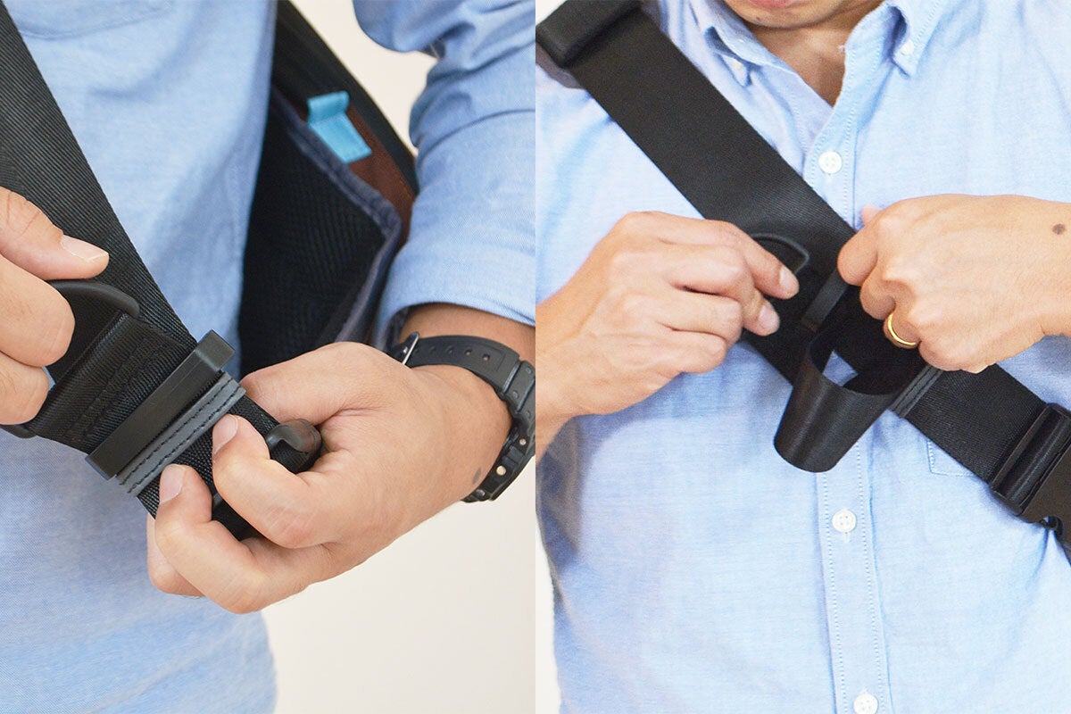 ベルトの先のDカンに指をかけることで長さ調節がしやすく、ベルトの余りを留められるクリップが付属しています。