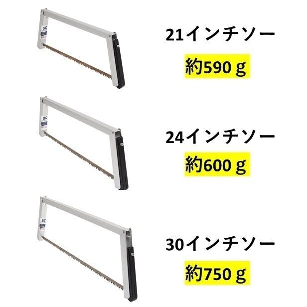ソロキャンプに最適な21インチソーは約53cm、ミドルモデルの24インチソーで約60cm、ロングモデルの30インチソーは約76cmの鋸刃が付属しており簡単にセットアップが可能です。
