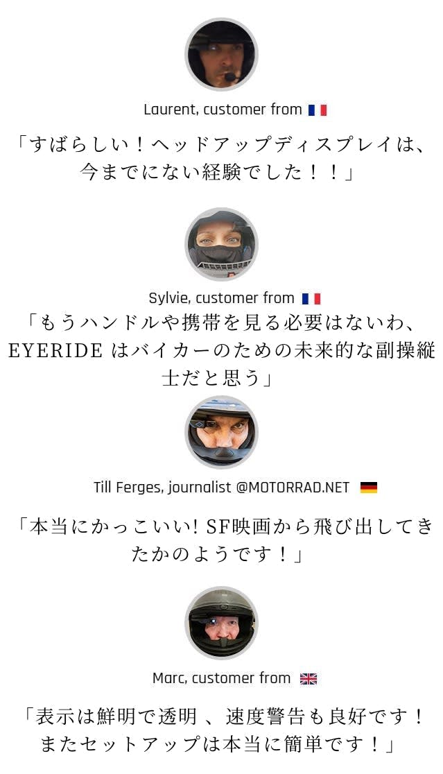 私たちは2017年に最初の製品を発売して以来、3000人以上の支援者の方々からフィードバックを収集し、技術向上に努めてまいりました。EyeRide HUDは、お客様の経験と私たちのチームの技術力が一つになった最高のデバイスです。