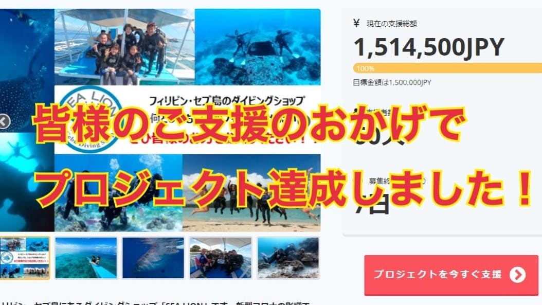 2020/10/09 12:15プロジェクト達成!!8月から開始しました本プロジェクトですが、昨日無事に達成することが出来ました!!本当に多くの皆様からご支援頂き誠にありがとうございます。ご支援いただきました皆様へこの度はシーライオンのクラウドファンディングにご支援いただきありがとうございました。皆様のおかげをもちまして目標金額を達成することができました。これはひとえに皆様がシーライオンを愛してくださっている証であると従業員一同、感謝してもしきれない思いでいっぱいです。本当に心よりお礼申し上げます。セブ島はいまだに観光客を受け入れることができない厳しい状況ではありますが、私達は絶対に負けません。今は皆様を迎えるために準備を整えています。昨年購入した船(シーライオン2号艇)をこのコロナ禍の中で少しずつできる範囲で改装しておりました。皆様にセブ島の魅力を存分に味わっていただき、ダイビングの楽しさをお届けし、皆様を笑顔にしたいと思っています。これから、10年、15年とずっと愛されるアットホームなショップを築いて参りますので、これからもご支援よろしくお願い申し上げます。最後に、この新型コロナウィルス感染症が早く終息し、皆様の笑顔に早く会えるよう祈りたいと思います。この度は本当にありがとうございました。引き続き、SEALION ダイビングショップをよろしくお願い致します。 SEALION ダイビングショップ オーナー 砂澤 武 また本プロジェクトは、10月17日を持ってプロジェクト終了となります。引き続き10月17日までご支援が可能ですので、皆様ぜひよろしくお願い致します。 リターン商品につきましてはプロジェクト終了後、ご支援者お1人お1人に詳細のご案内をさせていただきますのでお待ちくださいませ。またプランの内容に関しましてご質問がございましたら、弊社Eメール(info@sea-lion.jp)からご気軽にご連絡ください!皆様引き続きよろしくお願い致します!!Fumiya もっと見る