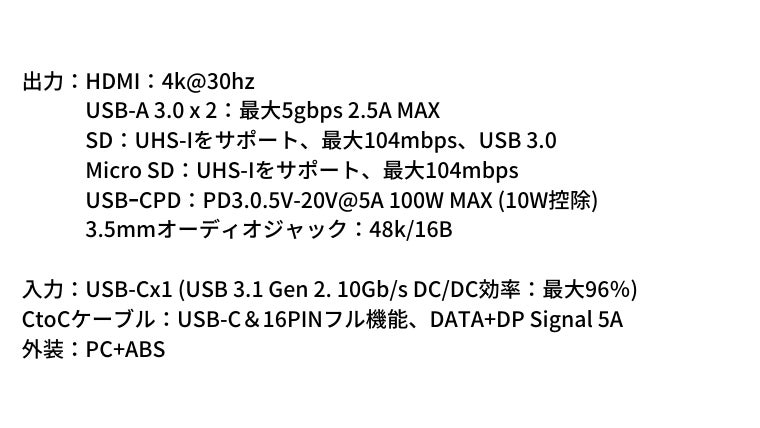 1つのUSB Type-Cポートを8ポート(SD/microSDカードスロット、HDMI、3.5mm audio、USB A 3.0×2、USB C 3.0×2)に拡張できます。