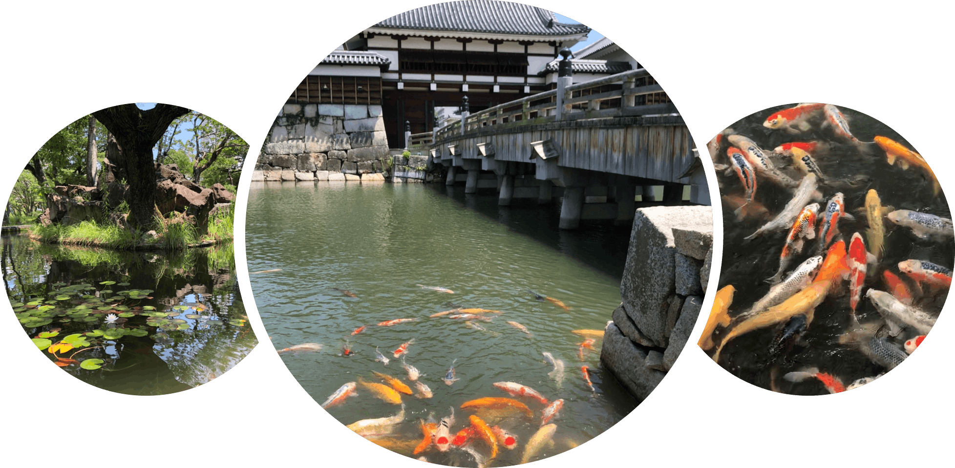 広島城は別名『鯉城』と呼ばれ、古くから鯉と深いつながりがあります。小西養鯉場と協力し、お堀の鯉の保存に取り組んできました。この約3年間、毎年錦鯉の放流活動などを経て、現在では約500匹の錦鯉がお堀に生息しています。発券所前の表御門の橋下には約300匹の色とりどりの錦鯉がエサを求めて集まってきます。