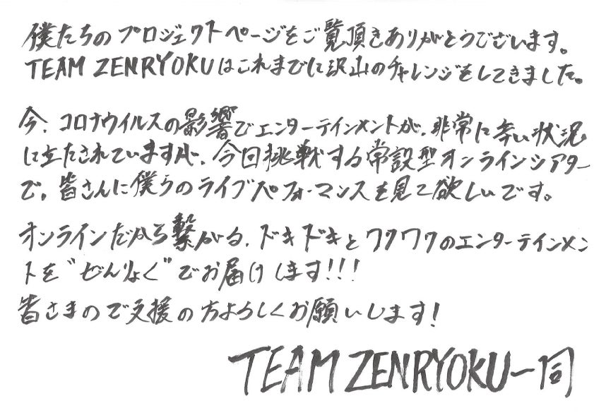 僕たちTEAM ZENRYOKUは、グループ名にも入っている通り「全力」をコンセプトに、何事にも全力で挑み、挑戦していくグループです!僕たちは、とにかくライブを楽しんでもらう事が大好きです。
