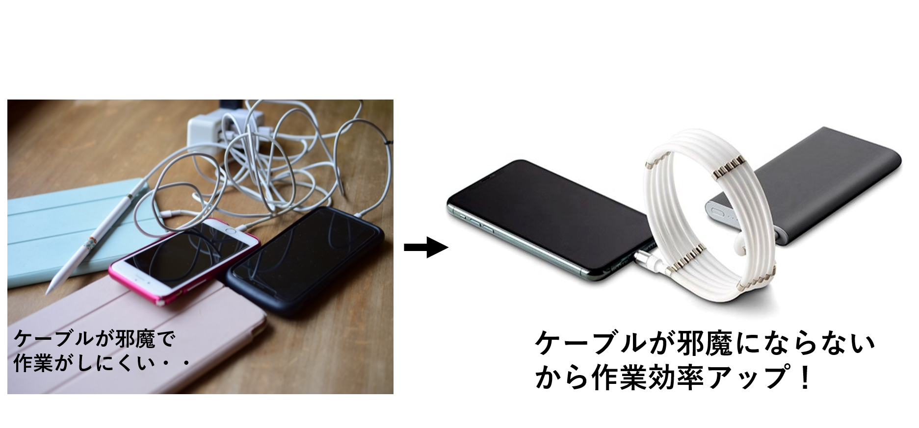 充電ケーブルのデメリットであったごちゃごちゃして絡まるという課題をスッキリ解決し、
