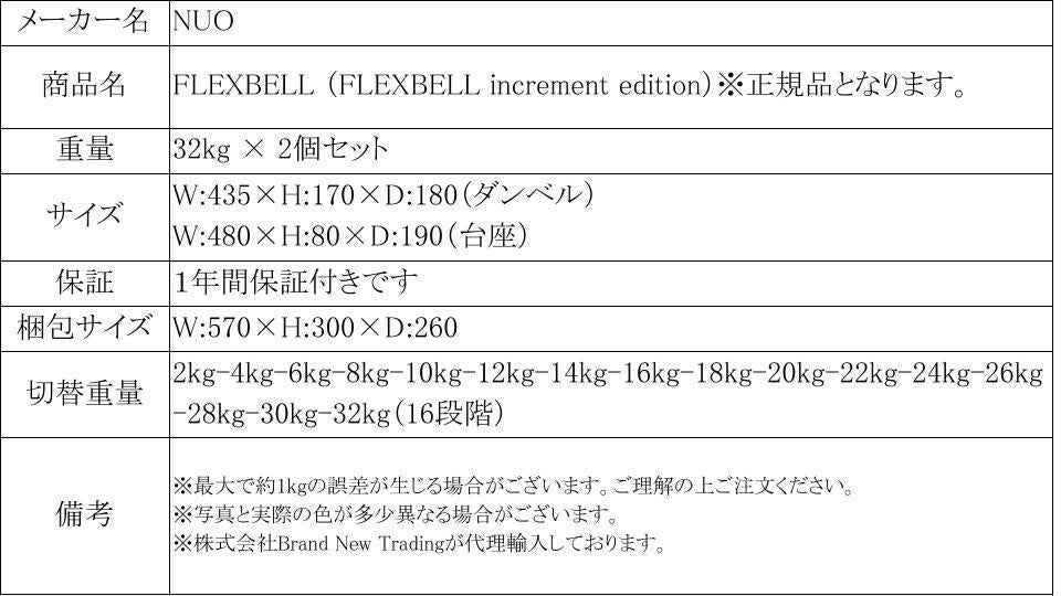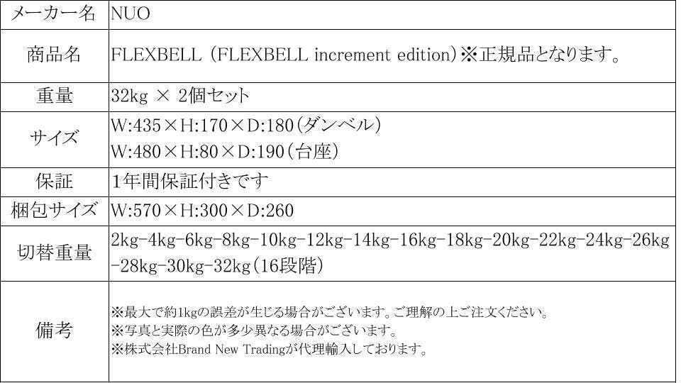 ・FLEXBELLは最大で約1kgの誤差が生じます。ご理解の上、ご注文下さい。写真と実際の色が多少異なる場合がございます。重量を重くするときに、シャフトを回して引っかかりがあったり、スムーズに回らない時は、一度重量を軽くしてシャフトを入れ直し、平行であることを確認してから、再度お試し下さい。引っかかりがあったり、スムーズに変更ができない状態で回すと、片方のバーがずれ、プレートが均等でなくなり修理不可能となります。また、この場合保証対象外となりますので、ご注意下さい。