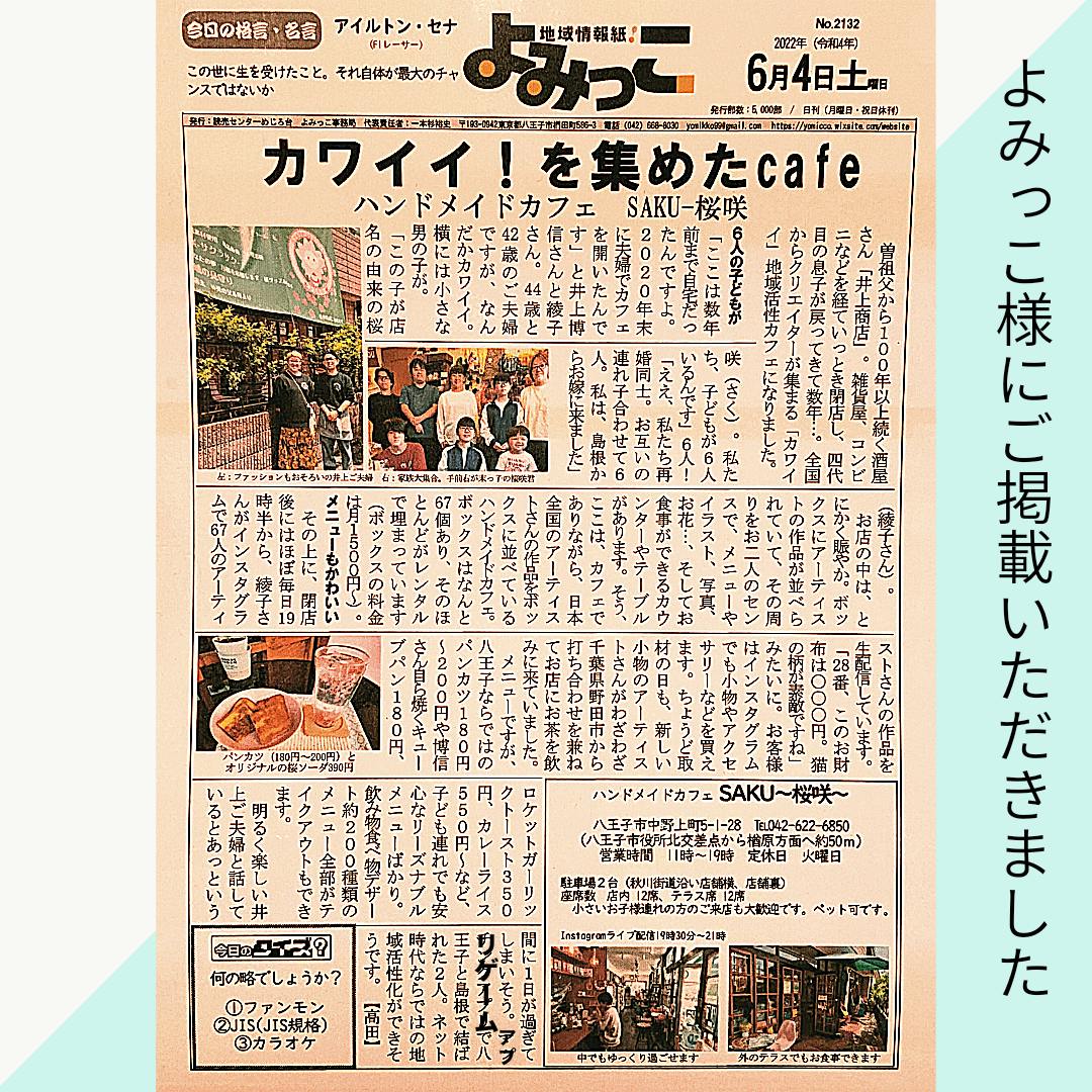 2022/11/23 01:11【活動報告20221122】 こんにちは、代表の井上です^^いつもありがとうございます。大変ご無沙汰しました。おかげさまで12月でカフェSAKUが2周年を迎えます!これも皆様のご支援のおかげです!ありがとうございます。たっっっくさん報告があります^^1.当店3度目のテレビ取材が入り、放映日が決まりました! テレビ東京系列 11/23(水・祝) 12:00~ 「かまいたちのオモロい協会見つけました!」 直前の連絡申し訳ございません。 ぜひご覧ください^^2.各マスメディア様にご紹介いただきました。 よみっこ様・八王子ジャーニー様版】 https://8dabe.com/2022/07/07/yomicco-2132-2/ Mはち様】 https://hachioji-life.com/?p=29610 八王子法人会様】 https://www.hojinkai.or.jp/ctype01/493 パーソナルライターおくやまふみ様】 https://note.com/pw_fuokumi/n/n7c69cfa414ce3.コラボいただきました。 東京八王子ビートレインズ様】https://twitter.com/hachiojitrains/status/1491317501611098115 たき坊】https://www.instagram.com/p/CkjFEA9Pt8K/?utm_source=ig_web_copy_link しまねっこ】https://www.kankou-shimane.com/shimanekko/goods_cat/sundries/#list ちりゅっぴ】https://www.city.chiryu.aichi.jp/shisei/about/chiryuppi/1453374985483.html#a20 西村園様】https://www.instagram.com/p/CjshIInPxx-/?utm_source=ig_web_copy_link 他4.カフェSAKUをご取材いただいた大学生さんの取材作品が 令和3年度八王子学生CMコンテストの審査員賞を受賞しました! https://youtu.be/k3d0MtkZwVo5.マルシェ出店しました。 第1回元八マルシェ】Mはち様に当店もご紹介いただきました。 https://hachioji-life.com/?p=30123 第1回川口マルシェ・第26回川口やまゆり館まつり】 https://www.instagram.com/p/Ck2fBiiPgQu/?utm_source=ig_web_copy_link 近日八王子市広報、JCOM八王子様をチェックください。 八王子手仕事アートマーケット】今年4回出店させていただきました。 12/10八王子のあの***様が主催の第1回イベントに出店いたします。 ホームページ、インスタグラムアカウントで近日アップいたします。6.カフェSAKU インスタグラムアカウントのLive配信回数が 1,600回を超えました! ありがとうございます^^ これからも素敵な作品の紹介、ほっこりできるLive配信を 行いますので引き続きよろしくお願いいたします。 また私個人のインスタグラムアカウントで「八王子人マップ」という お世話になっているご活躍されている方を紹介する企画をスタートして 今日現在25回(26名)紹介しました。 https://www.instagram.com/saku_saku_0330/7.当店が東京都認定の「とうきょう特産食材使用店」登録されました。 https://www.ouenten.metro.tokyo.lg.jp/shop/info_587/8.昨年の11月に店内増床いたしました。 「2.」Mはち様ご記事に増床後の店内ご紹介があります。たくさんの報告にお付き合いいただきましてありがとうございました。ご支援いただきました「リターン」の有効期限2年が来月2022年12月までとなっておりますのでコロナ対策ばっちり実施して、ご来店お待ちしております。どうぞよろしくお願い申し上げます。ハンドメイドカフェSAKU代表 井上博信 もっと見る