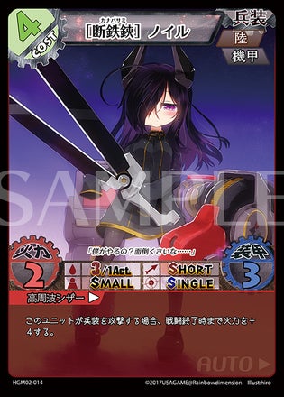 2017/09/26 19:363枚目です!USAGAMEのひろです~! 今回は「[断鉄鋏]ノイル」のご紹介です! この兵装にはHAGMI!シリーズおなじみの、ペンタードのノイルちゃんが搭乗してますね。 火力対燃費の効率は非常に悪いですが、スキル「高周波シザー」の効果で、兵装を攻撃する際のみ火力が+4されます! 装甲改修などで固められたユニットや、燃料切れのユニットを始末するのにぴったりな能力ですね。 ただし、射程は短く装甲も高いとはいえないので、扱いには注意が必要かもしれません。 収録されている「AdvancedCombat」には射程がSHORTのカードしか含まれていませんので、単体セットで遊ぶ際は大活躍してくれるでしょう! イラストは僕です! それでは、HAGMI!02よろしくお願いします~! ひろ もっと見る