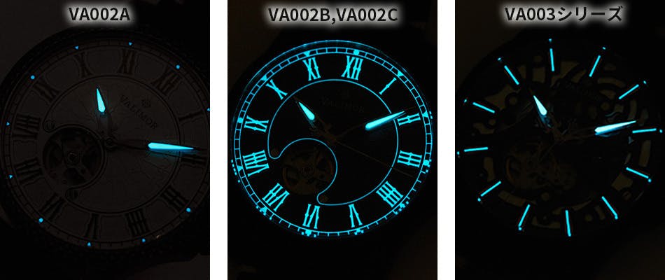※VA002BとVA002Cはローマ数字や針が、VA003シリーズもインデックスや針が光ります。VA002Aの背景色が淡い白色なので、ローマ数字に、代わりに黒のメタルガンカラーをインデックスに塗りました。
