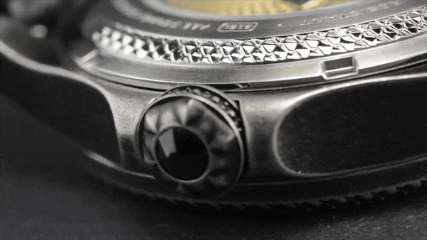 新設計のリューズは、耐水性能を維持しつつ、人間工学に基づいたスムーズな操作性を向上させるための形状になっています。デザインは、伝説的なアーサー王の王冠からヒントを得ています。王冠を想像させる為、最高級の輝きを誇るスワロフスキークリスタル(ブラック)をリューズに使っています。