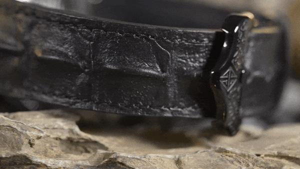 龍の尻尾をイメージしたオリジナルのストラップデザインです。ワニの皮に最先端の技術を用いて、繊細な3Dスキャンをすることで、ワニの皮のような模様を再現しました。この3Dスキャンをもとに、金型を開発し、「ドラゴンレザー」を製作しました。素材は牛革の本革、トップグレインレザー。トップグレインレザーは、耐久性があり、ソフトで高品質な肌感です。すべてのストラップには、剣の柄に影響されたオリジナルのバックルが付いています。細部にまでこだわったストラップです。