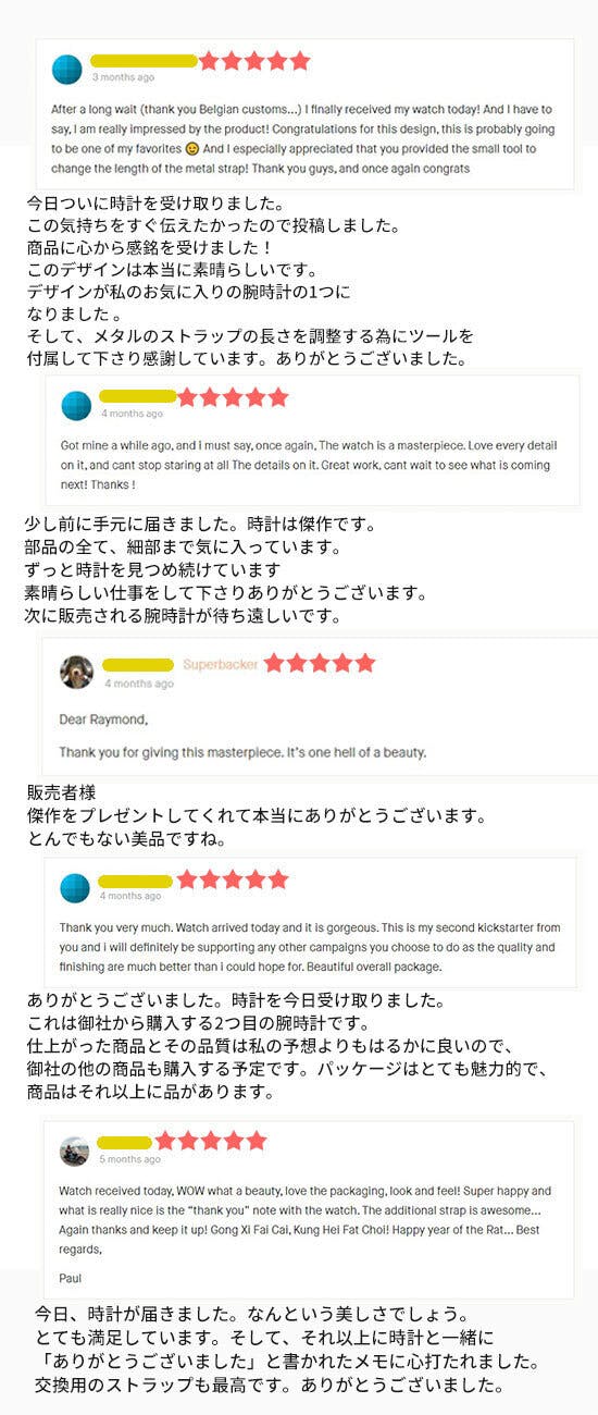 2021/09/15 21:29ご覧頂きありがとうございます。https://camp-fire.jp/projects/view/458149新しいモデル、CaliburnusIIは確認しましたか?パワーリザーブも60時間とグレードアップ!宝石のひとつであるオパールを日本で管理培養したものを文字盤に使用しました。WEBメディア GIZMODO様にご紹介頂きました。-----着ければまるで勇者気分? 聖剣の名を冠する機械式ウォッチ「Caliburnus」を装着してみた!悠久の時を刻もうではないか!そんなセリフをつい口ずさみたくなる機械式腕時計「Caliburnus(カリブルヌス)」が姉妹サイトmachi-yaに登場していました。クリスタルのように煌めくオパールの文字盤や聖剣エクスカリバーの原典を製品名に用いるなど、ドラクエやFFなどの名作ゲームに夢中になった皆さんなら心をくすぐられるのではないでしょうか。ロマン溢れる時計にしあがっているのか、実際にサンプルをお借りして使ってみた感想をお届けします!ぜひご確認下さい。記事はこちらhttps://www.gizmodo.jp/2021/09/machi-ya-caliburnus-review.html もっと見る