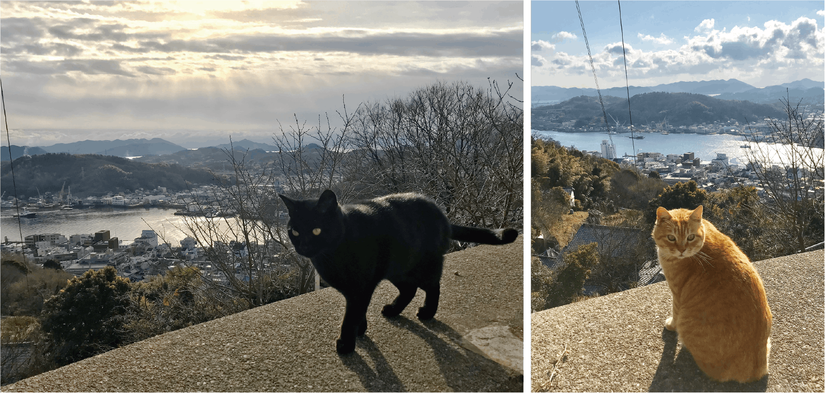 尾道は、海と山に囲まれた箱庭のような景観を形成し、住宅や寺社が山の斜面に立ち並び、いつしか「坂の町」といわれるようになりました。石段と細い路地が続く斜面地は、車も通らず、猫にとって安全な環境。そのため人に馴れている猫が多く、人々と共生しています。