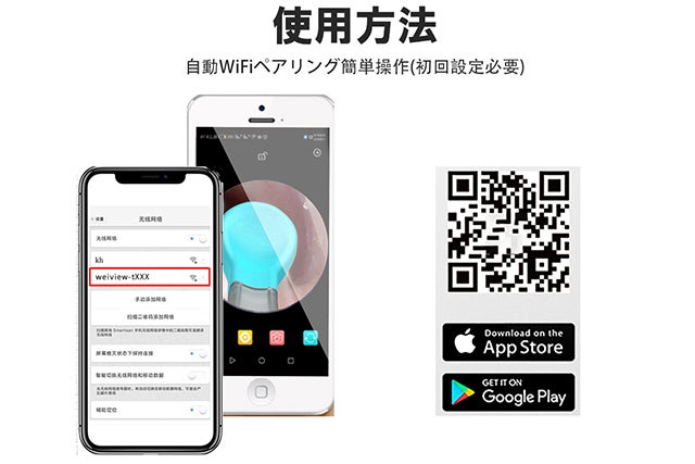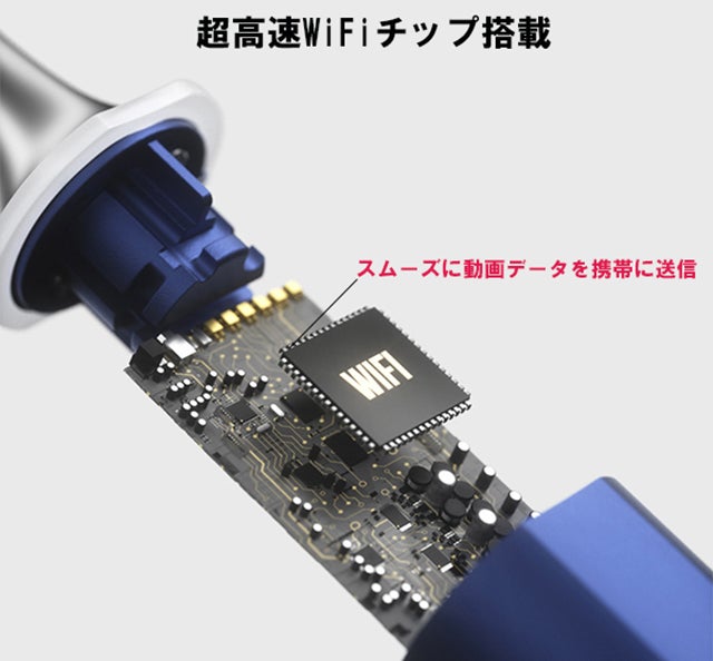 本体内部には超高速WIFIチップが搭載されており、スムーズに動画データを携帯アプリに送信することができます。これにより、携帯に映し出される耳の中をリアルタイムに確認することが可能です。