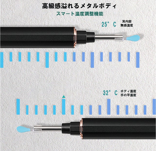 本体は高級感にあふれるアルミボディ設計になっており、同時に本体の手で持つ部分と耳の中に入れる部分は、それぞれ手の平温度、耳内部温度に合わせて制御することで、より快適に安心的で耳のケアができます。