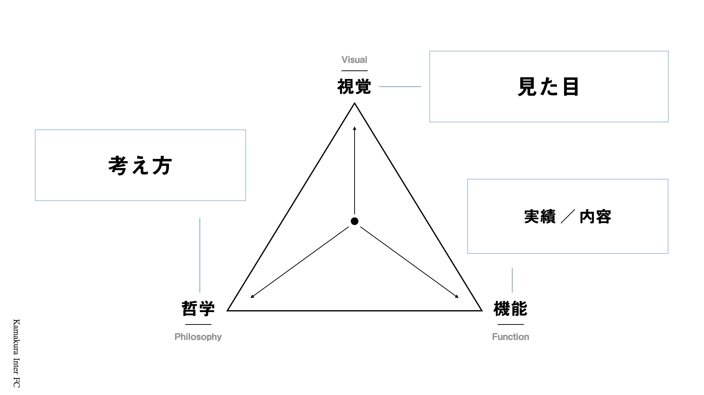 鎌倉インターナショナルFCは、このリブランディンを通じて、よりクールで「カッコいい」サッカークラブに生まれ変わります。そして、私たちにとって「カッコいい」とは『視覚』『哲学』『機能』の三要素で構成されています。