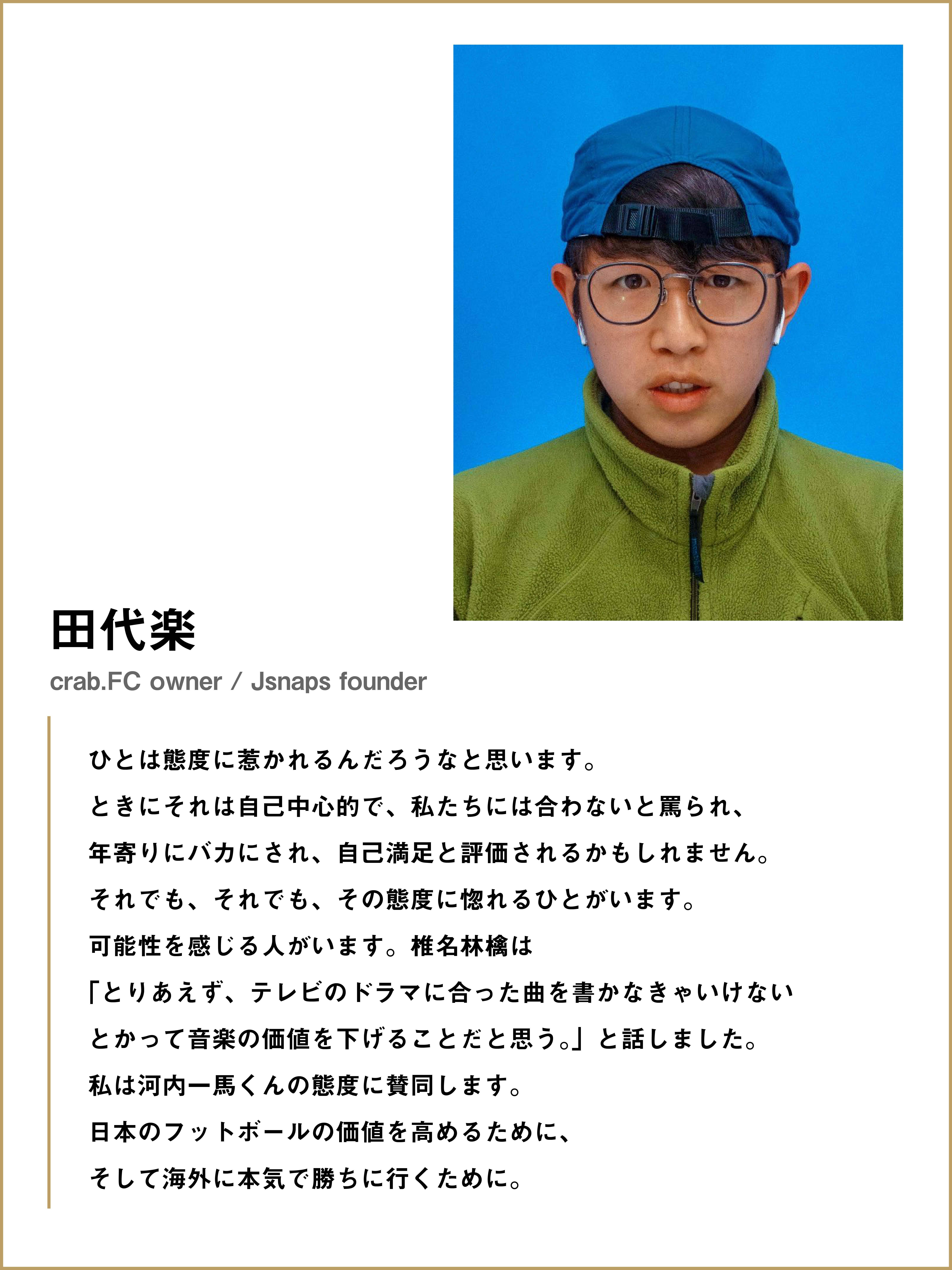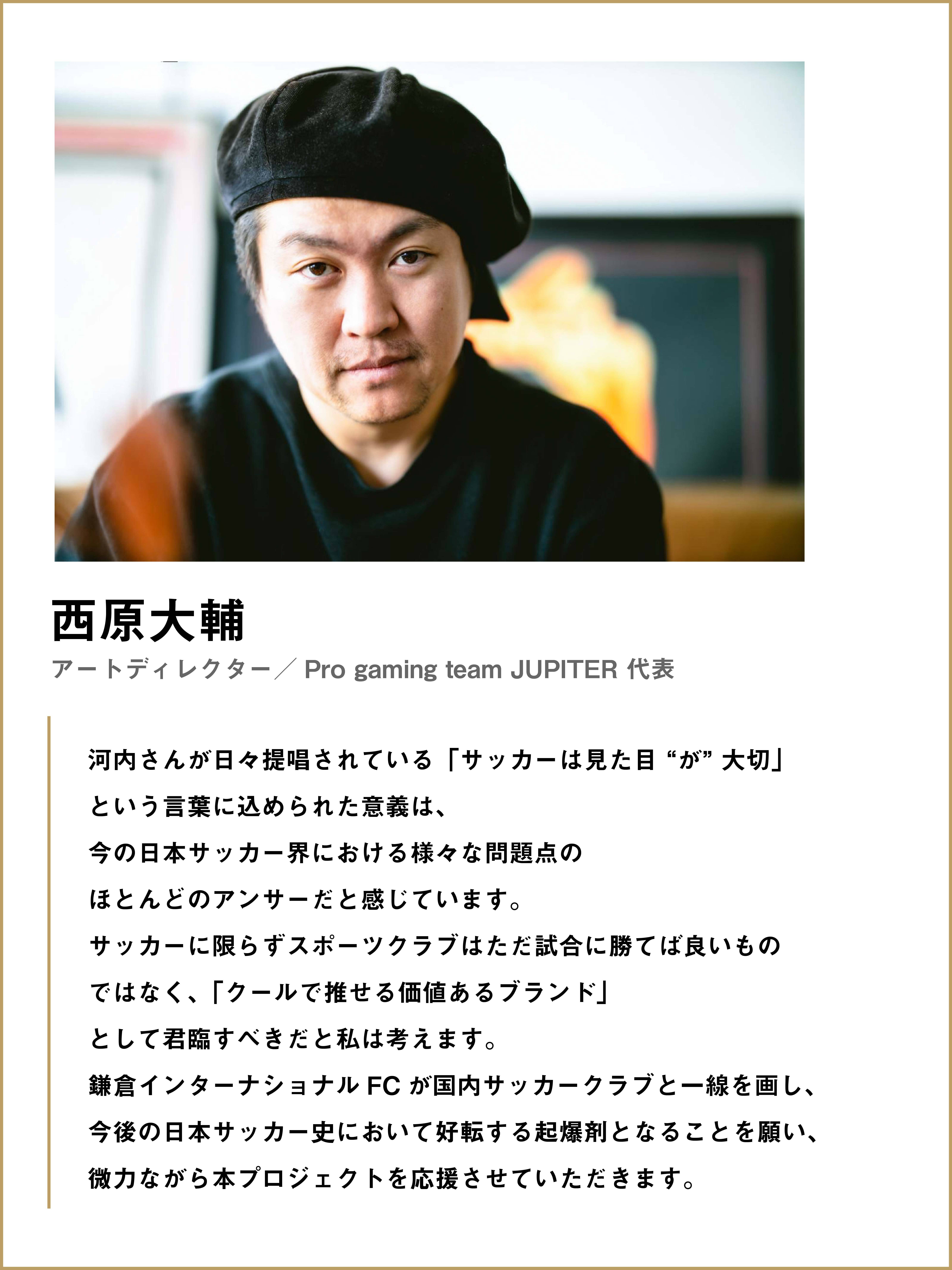 サッカークラブが「カッコいい」コミュニティになっていくためには、サッカーまたはスポーツ業界の「外」からクリエイターを集め、表現し続けなければいけないと私たちは考えています。鎌倉インターナショナルFCは、クリエイター集団『SEE BY』や、同じ思いを持ったプロフェッショナルのフォトグラファーとタッグを組むことで、これまでの日本サッカーとは一線を画した「ビジュアル」をつくっていきます。