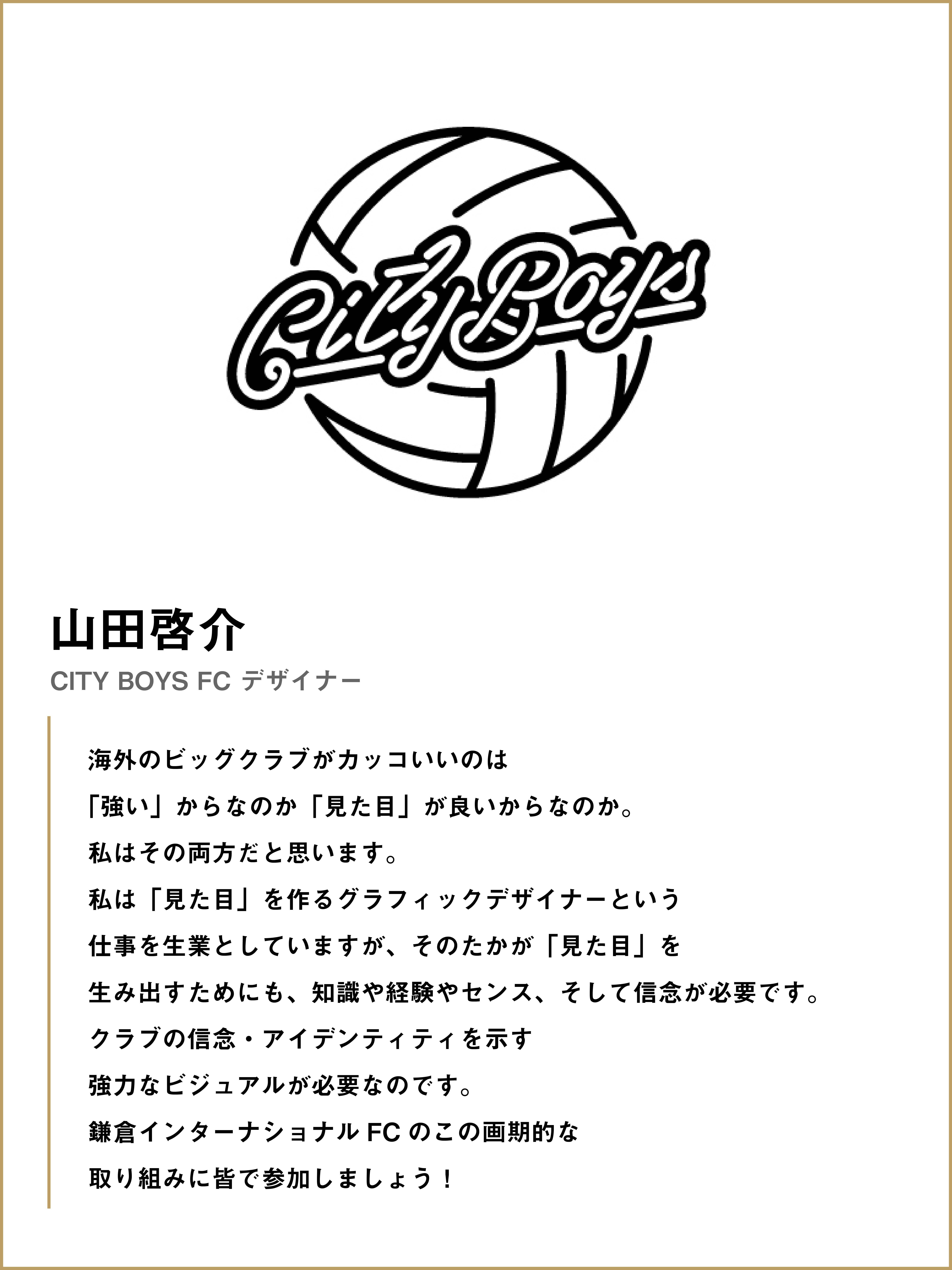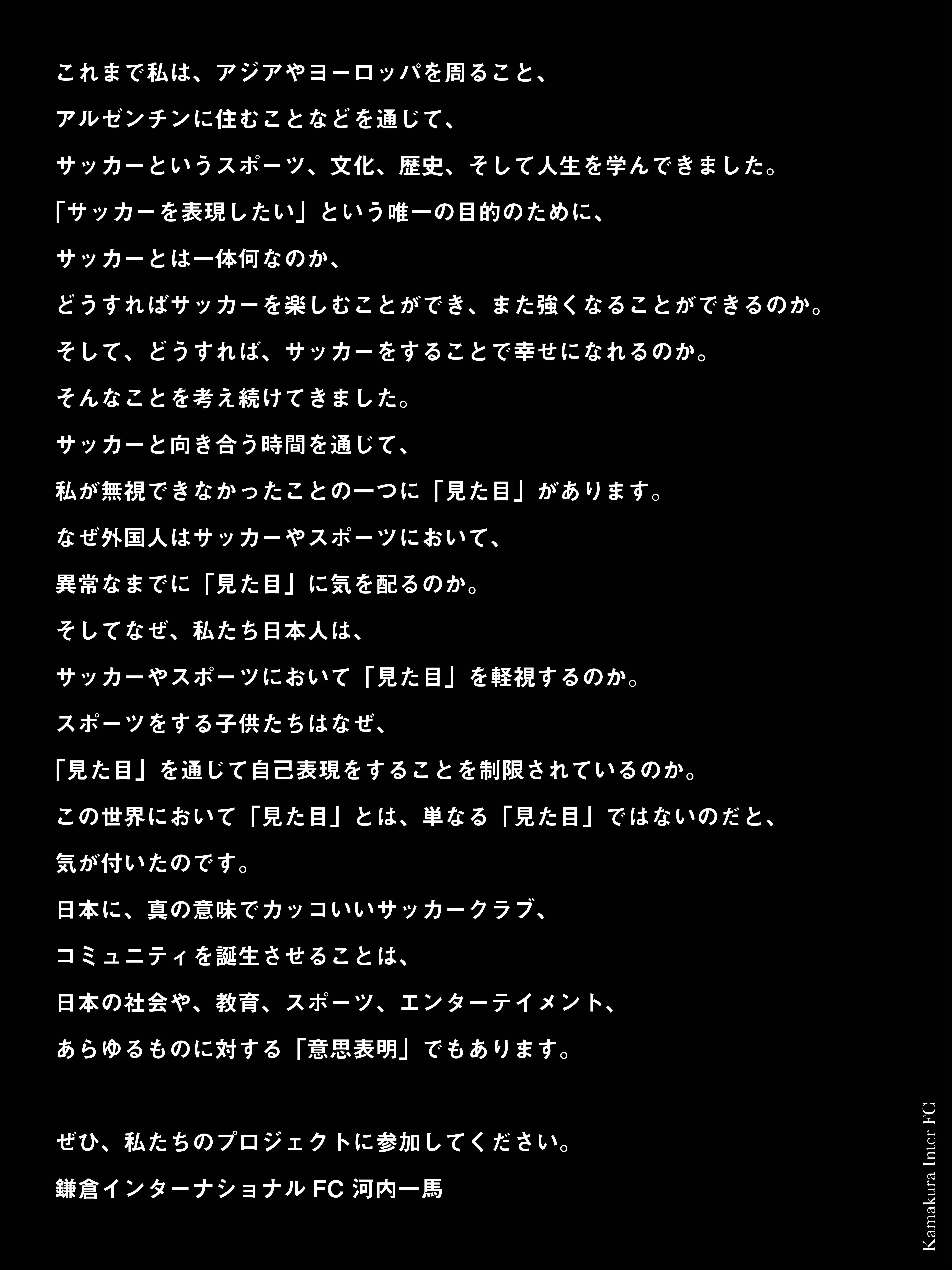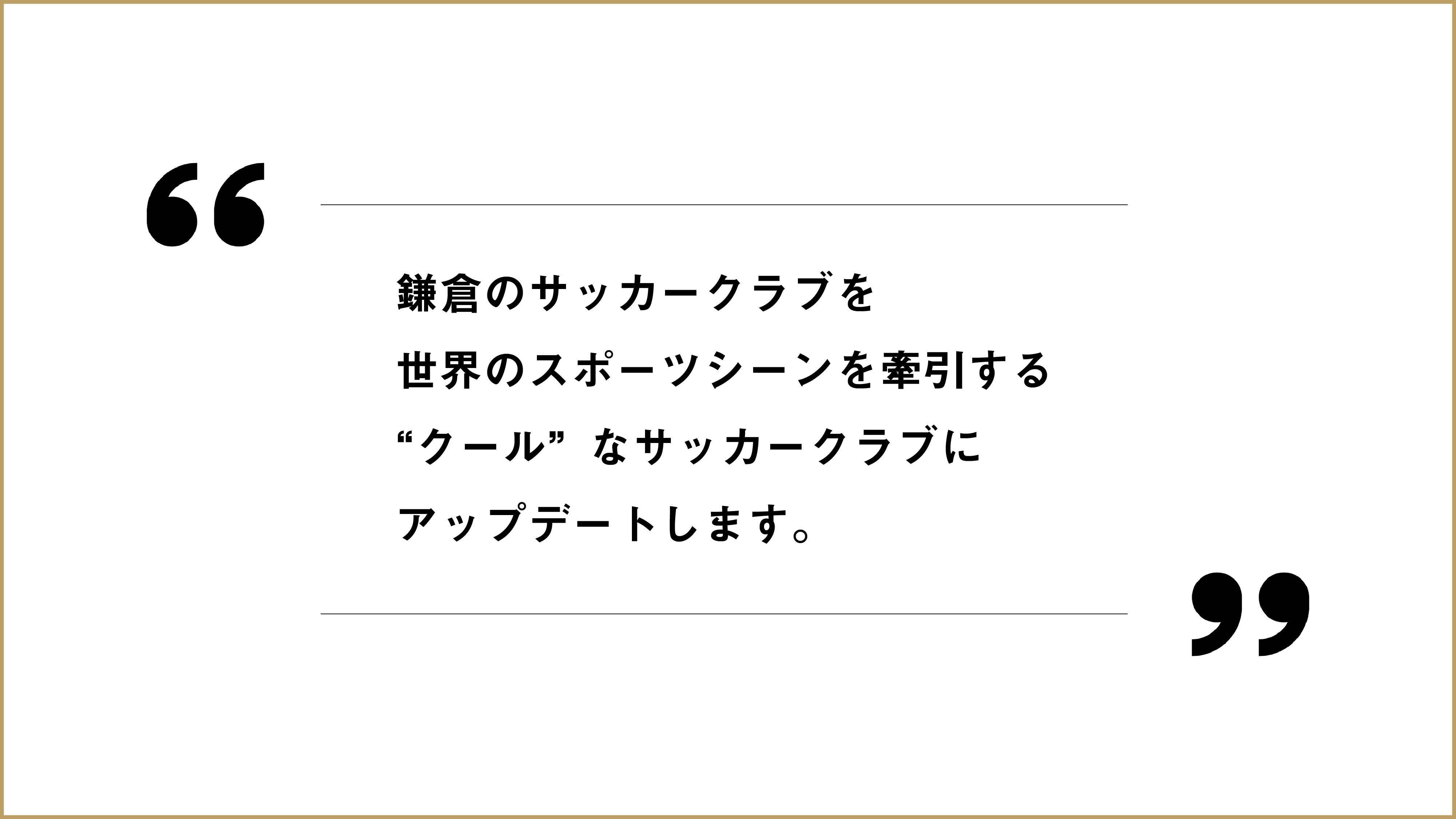 皆さんは海外のスポーツクラブやサッカークラブを見て『カッコいい…』と憧れたことはありますか?私たちは、それを憧れで終わらせることに終止符を打ちたいと思います。鎌倉を本拠地とするサッカークラブ【鎌倉インターナショナルFC】を、世界のスポーツシーンを牽引する“クール”なサッカークラブにアップデートします。