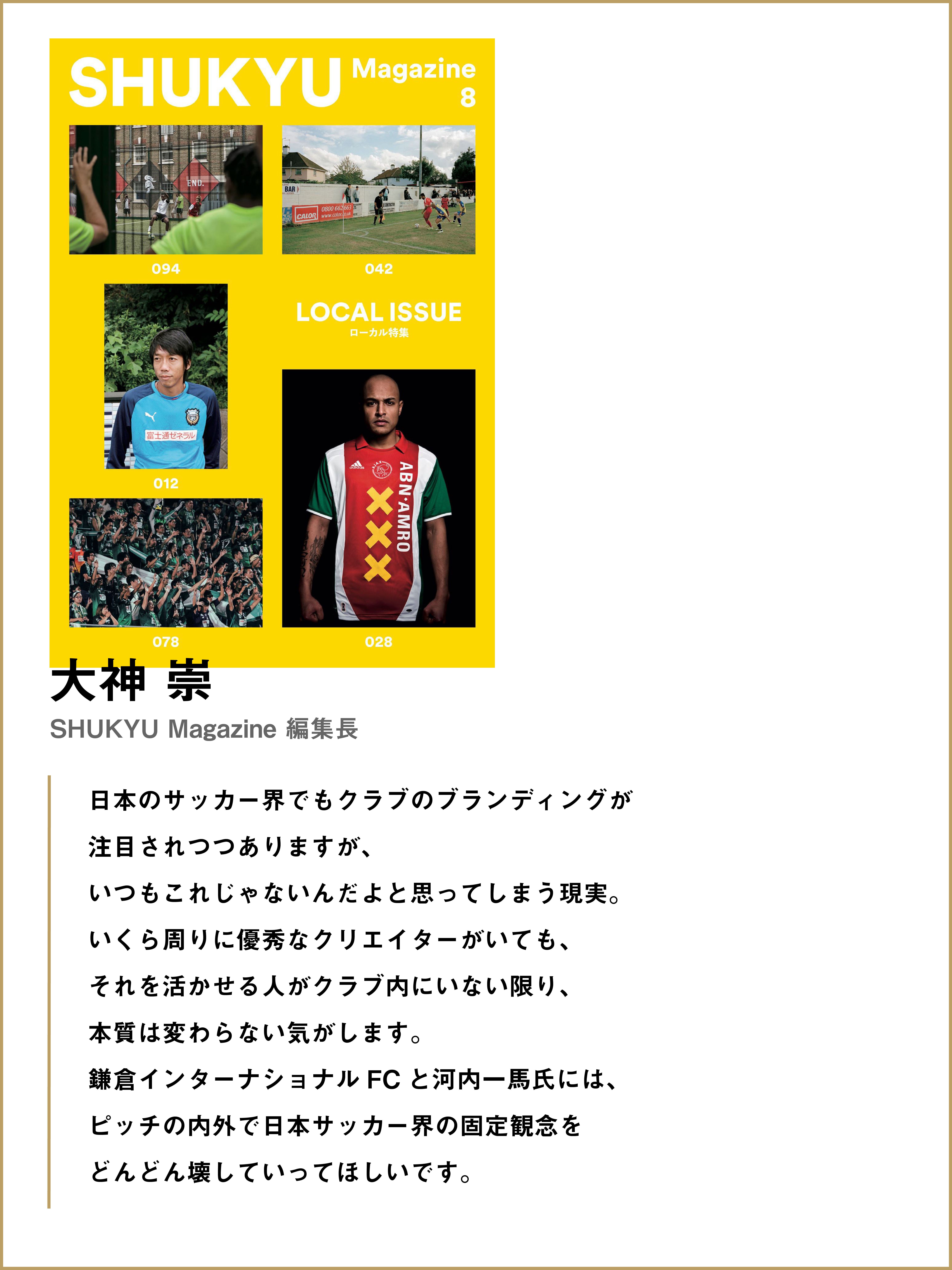 SHUKYU Magazineは、東京を拠点に活動するフットボールカルチャーマガジンです。選手・クラブ・サポーターからファッション・アート・建築・食まで、ゲームの背後に存在する様々なもの・ことを独自の視点で読み解いていきます。また、印刷物・WEB・グッズ・イベントの企画制作や、アーティスト・ブランド・サッカークラブとのコラボレーションも積極的に行っており、従来のメディアの枠にとどまらない活動で、サッカーが持つ可能性を探っています。