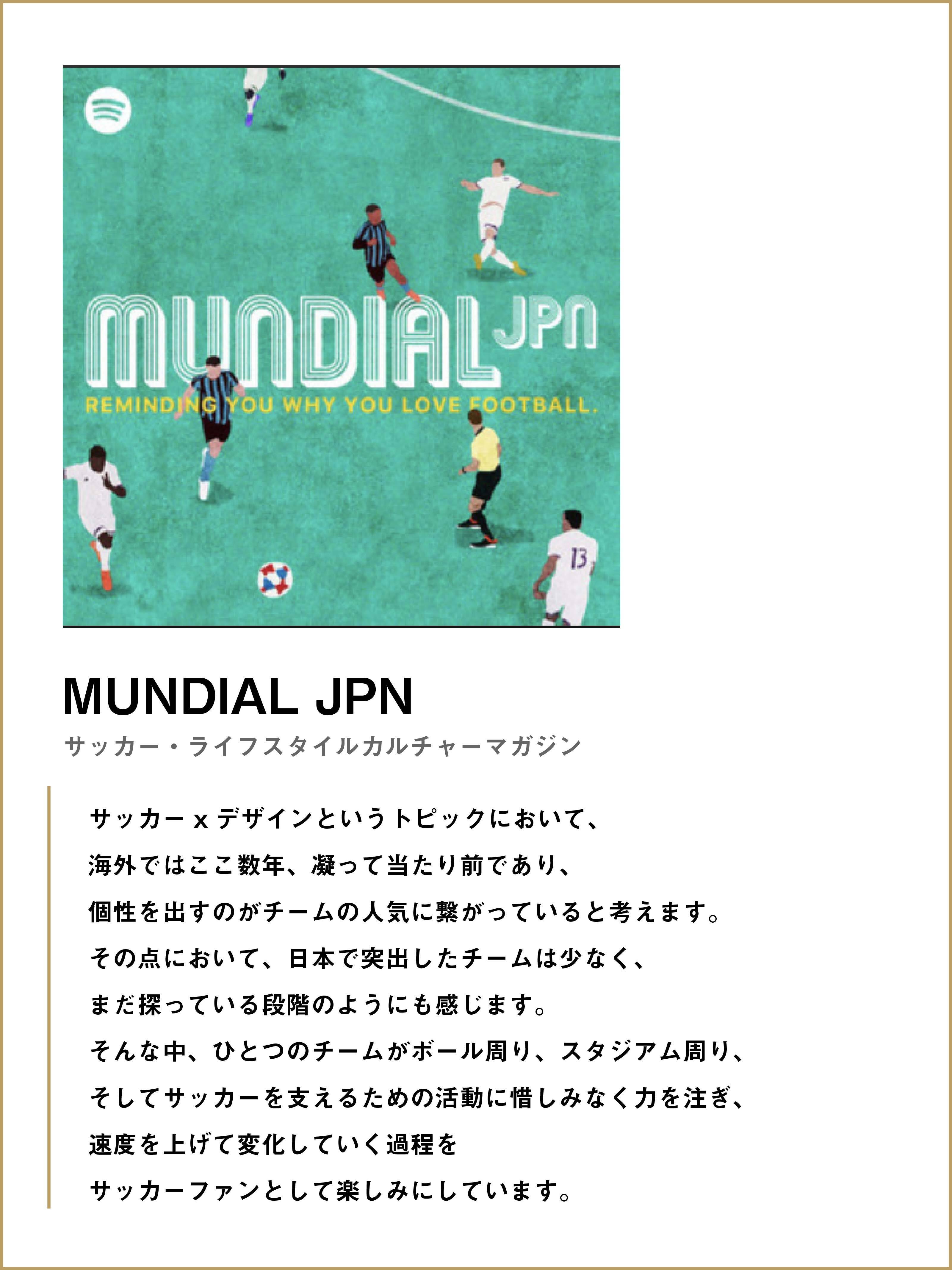 また、MUNDIAl JPNは現在、雑誌以外にも活動の幅を広げ、サッカーのクリエイティブな部分を切り取る集団としても活躍。キャスティング、動画制作やSpotifyとタッグを組み、日本で初となるサッカーポッドキャスト「MUNDIAL JPN」を配信中。