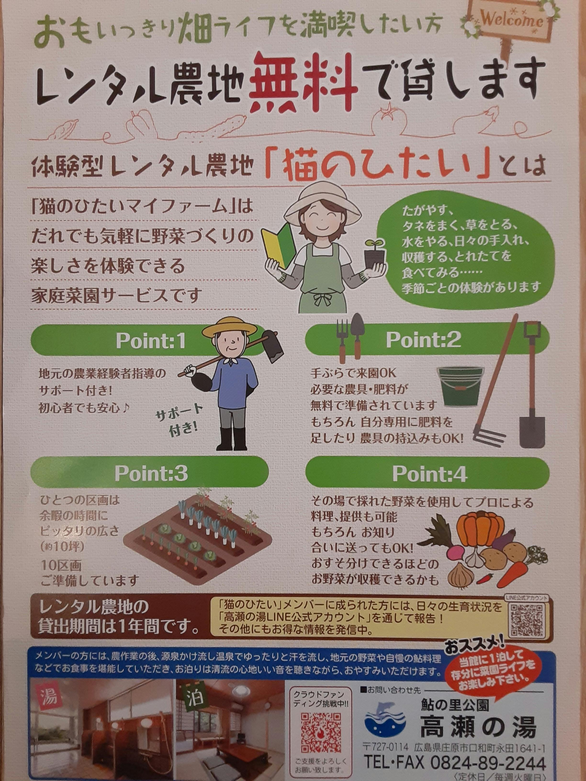 土地の一部を耕地整備し、3坪10区画に分け、ご希望の方に「猫のひたい」程の農地をお貸しします。レンタル料金は無料で、期間は1年間です。地元の農業経験者指導のもと、季節に応じてご希望の作物の育成を体験することができます。肥料は地元の酪農家が育成する牛の糞から作った天然の堆肥を使用し、化学肥料は使用いたしません。その他道具などの無料貸与。日々の生育状況は「LINE公式アカウント」を通じて利用者に報告され、収穫時期には採れた野菜を使用した料理を提供させていただきます。もちろんお家に持って帰っていただき自分で調理しても、お知り合いに送っていただいてもOKです。