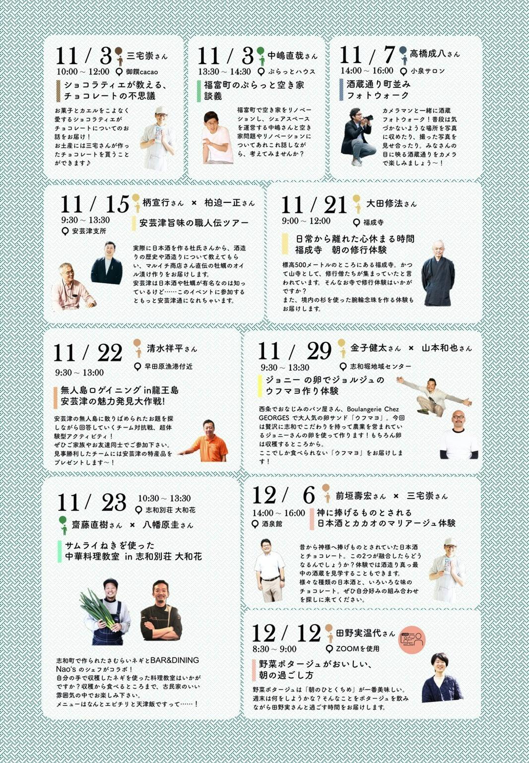 2021/10/21 19:25昨年、皆さまのご支援いただき、東広島ではじめて開催させていただきました『ヒトコト博』ですが、今年も11月3日~12月19日の予定で開催させていただきます!今年は昨年よりさらにパワーアップし、多くのホストの皆さんのご協力により、19の体験を実施する予定です。新たなコラボ体験はもちろんですが、ジョニーの卵でジョルジュのウフマヨ作り体験や安芸津旨味の職人伝ツアーなどの昨年より継続して実施する体験もあります。ただ観光スポットを巡るのではなく、その地域のひととのふれあいを大切にし、地域のヒトの魅力をコトで体験する『ヒトコト博』にご参加いただき、今まで知らなかった身近な地域の人の魅力にふれていただければ幸いです。https://michishirube.info/hitokoto/ もっと見る