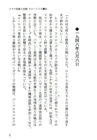 今回は当サークルが2020年冬に発表を予定している全年齢向け小説同人誌『ナチス怪獣大決戦 ネロハイドラ襲来(仮)』の各種費用820,925円をご支援頂けないかと思い、クラウドファンディングの企画を立ち上げました。