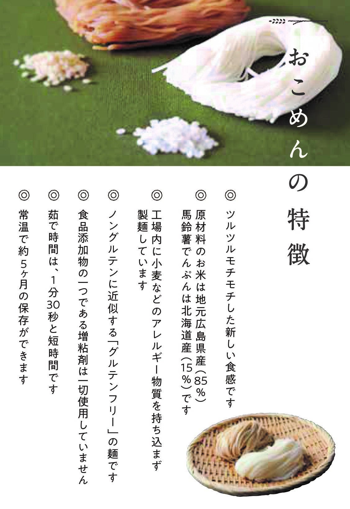 「おこめん」は、広島県産のお米からつくった米粉と少しだけジャガイモの澱粉を合わせて作ったお米の麺です。