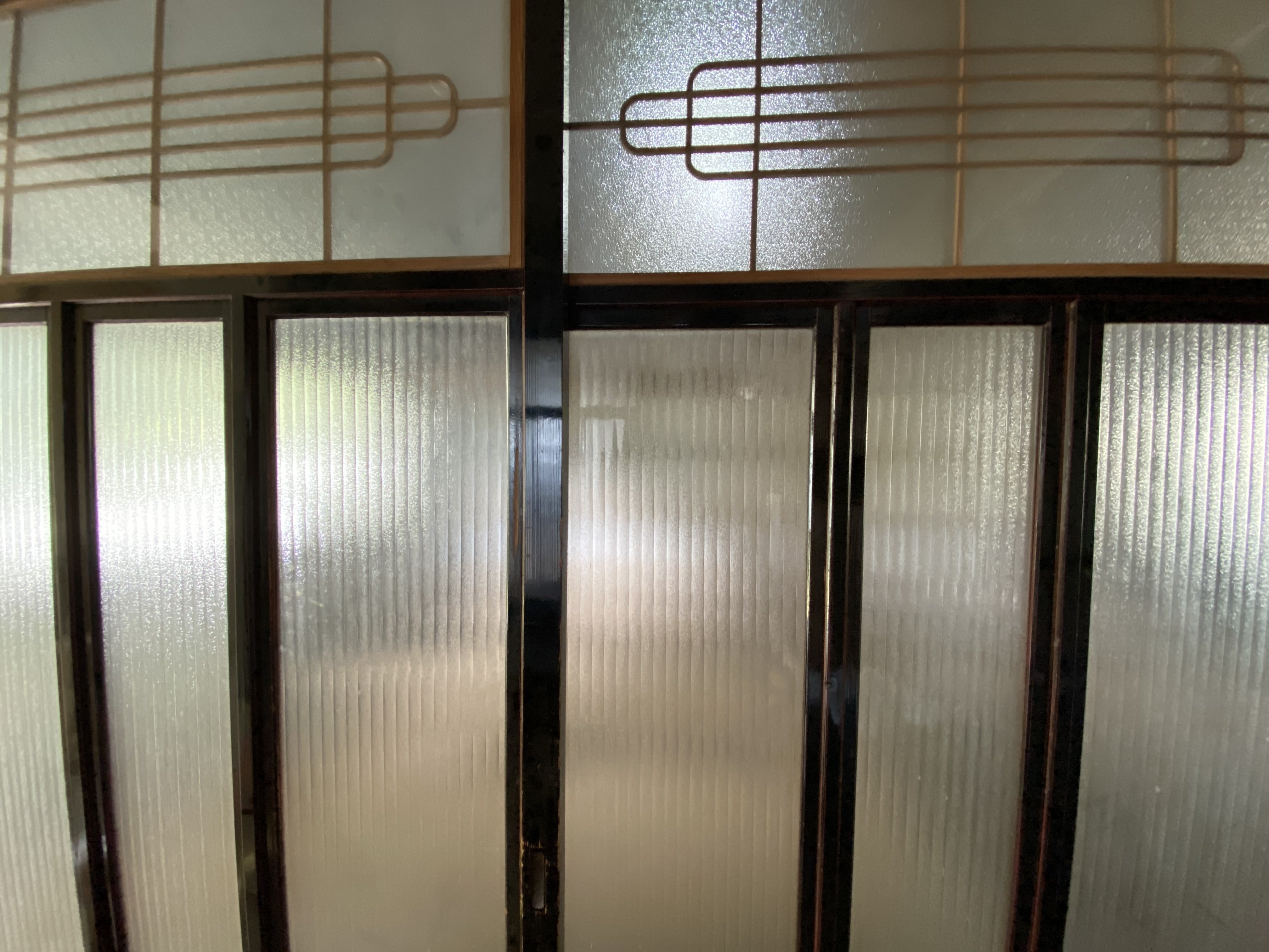 築86年ならではの物も見つかりました。戸にはめ込まれた板ガラスは、模様もさまざまで今では手に入りにくい昔の職人さんでしか作れない貴重なものです。