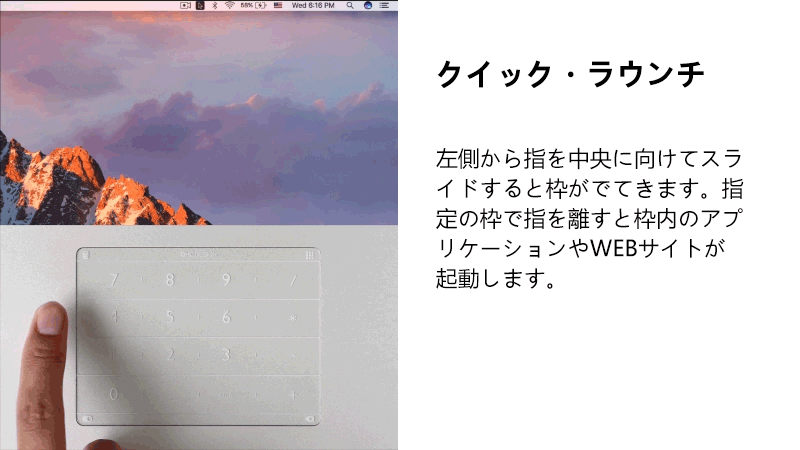 トラックパッドの「左外から中央へ」指でスワイプすると、「ランチャーモード」に。あらかじめ登録したアプリやサイトの場所へ、指を離さず移動しクリックすると、すぐに起動またはサイトのページへ飛びます。