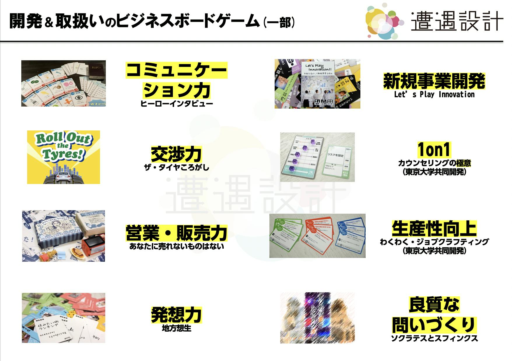 これまでに、十数個のビジネスボードゲーム開発や、多くの研修を実施してきました。