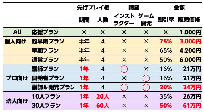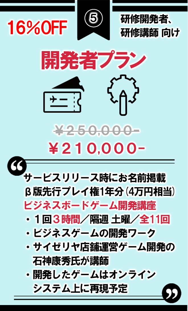 5.開発者プラン 講座11回+先行プレイ権1年分 21万円(16%OFF)