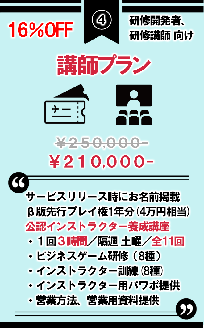 4.講師プラン 講座11回+先行プレイ権1年分 21万円(16%OFF)