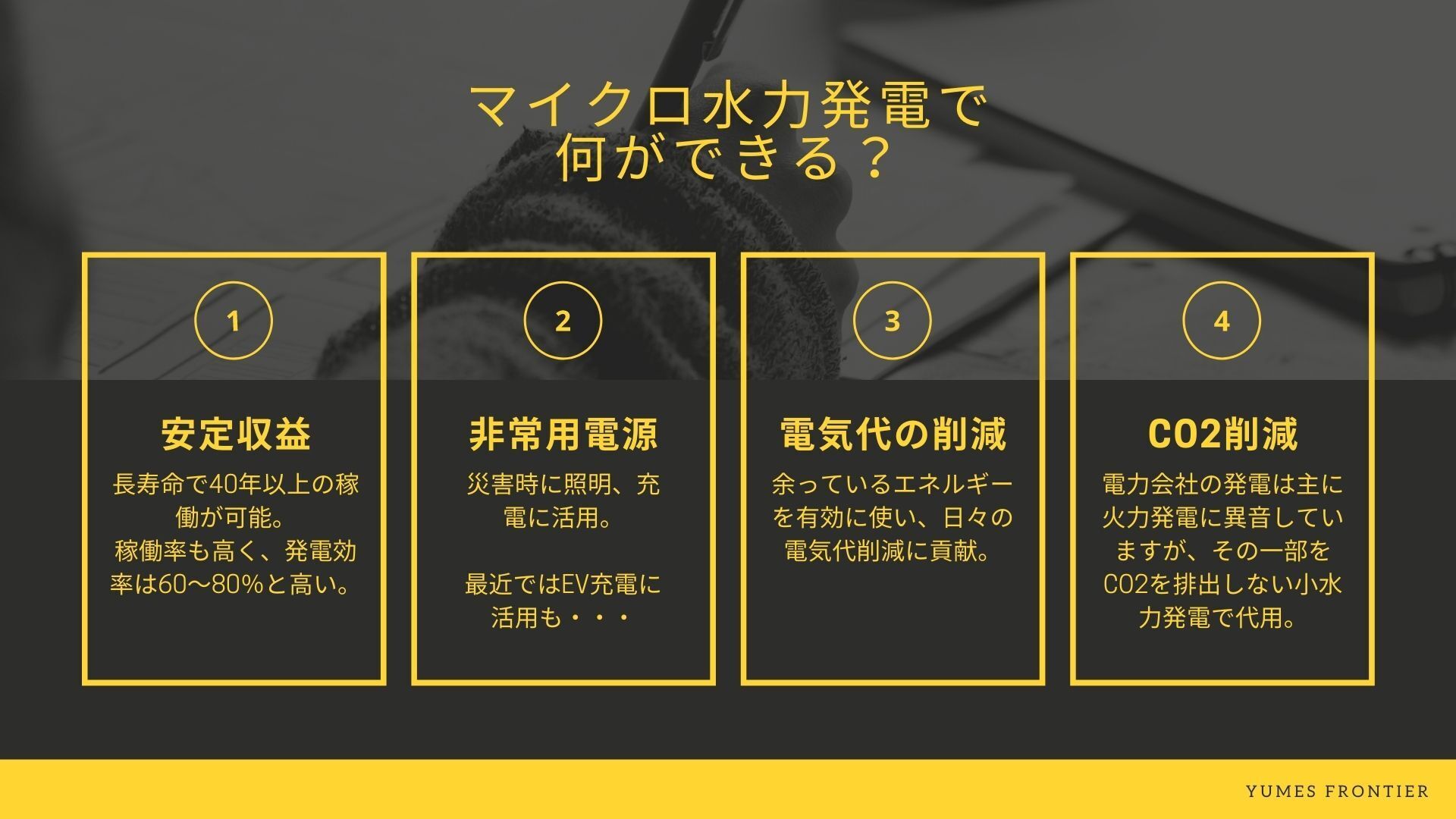 マイクロ水力発電が普及すれば、リスクを回避するためにも 大規模発電に頼らない分散型のマイクロ発電が実現できると考えています。